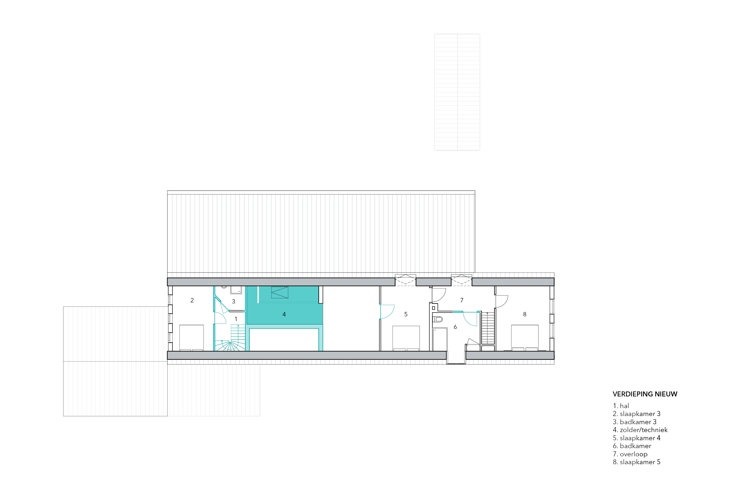 In het oorspronkelijke woonhuis bevonden zich al meerdere kleine slaapkamers en een badkamer. Hier zat ook de voordeur van de woning met een klein halletje.